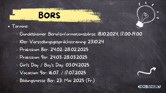 im BORS-Channel auf schul.cloud erhalten Sie viele Informationen über Ausbildungsbetriebe, offene Stellen, Tage der offenen Tür von weiterführenden Schulen und und und. Also gerne beitreten und