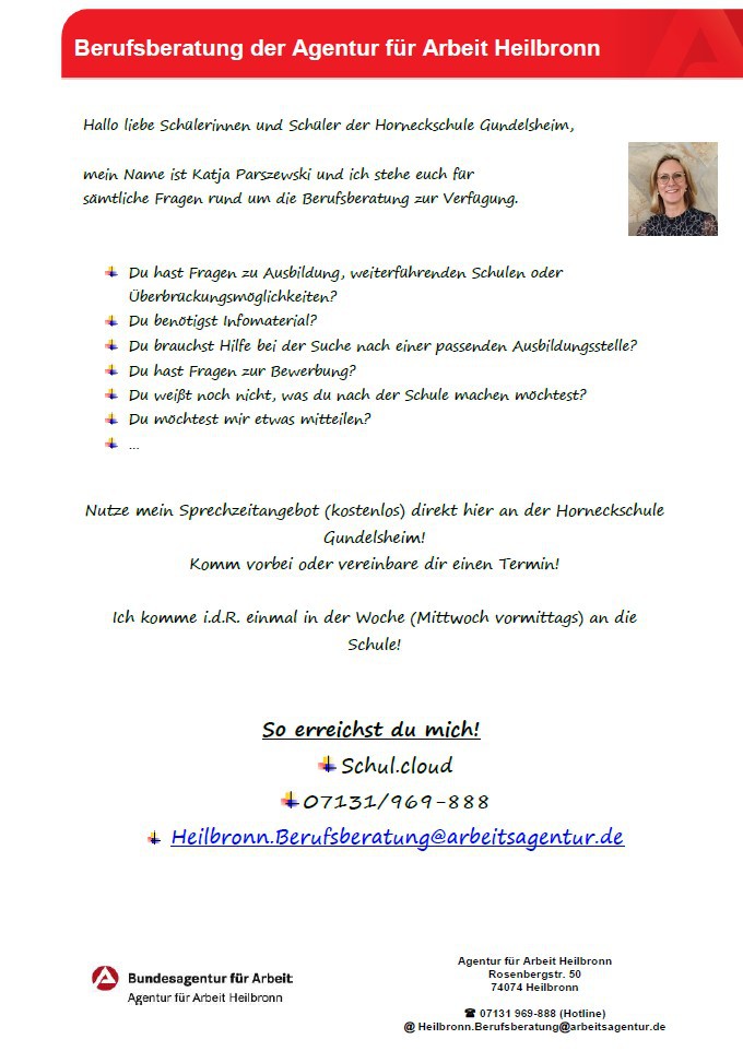 Ab Klasse 8 begleitet Frau Parszewski von der Arbeitsagentur Heilbronn die Schüler bei ihrer Schul- und Ausbildungsplatzsuche mit Einzelgesprächen und Vorträgen.